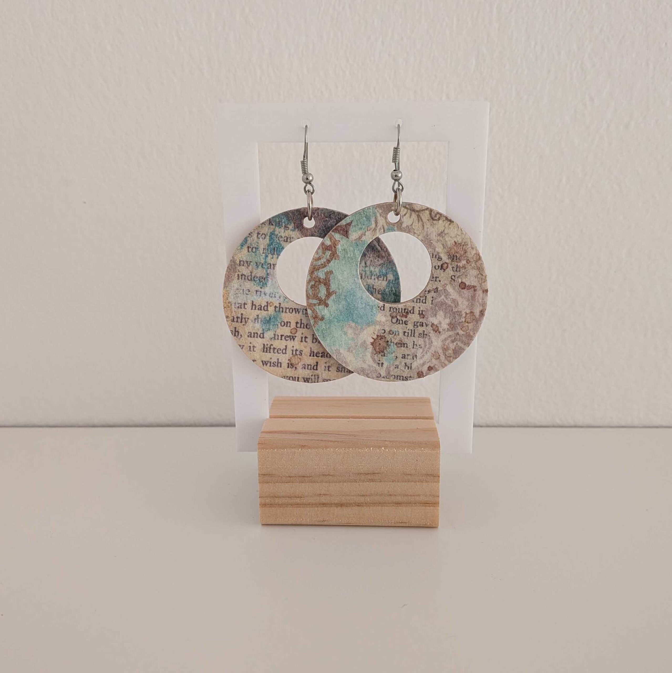 Σκουλαρίκια διακοσμημένα με την τεχνική του ντεκουπάζ. Το μοτίβο με γράμματα χαρίζει ένα διακριτικά vintage ύφος, ιδανικό για όσες αγαπούν τη ρομαντική και καλλιτεχνική αισθητική.