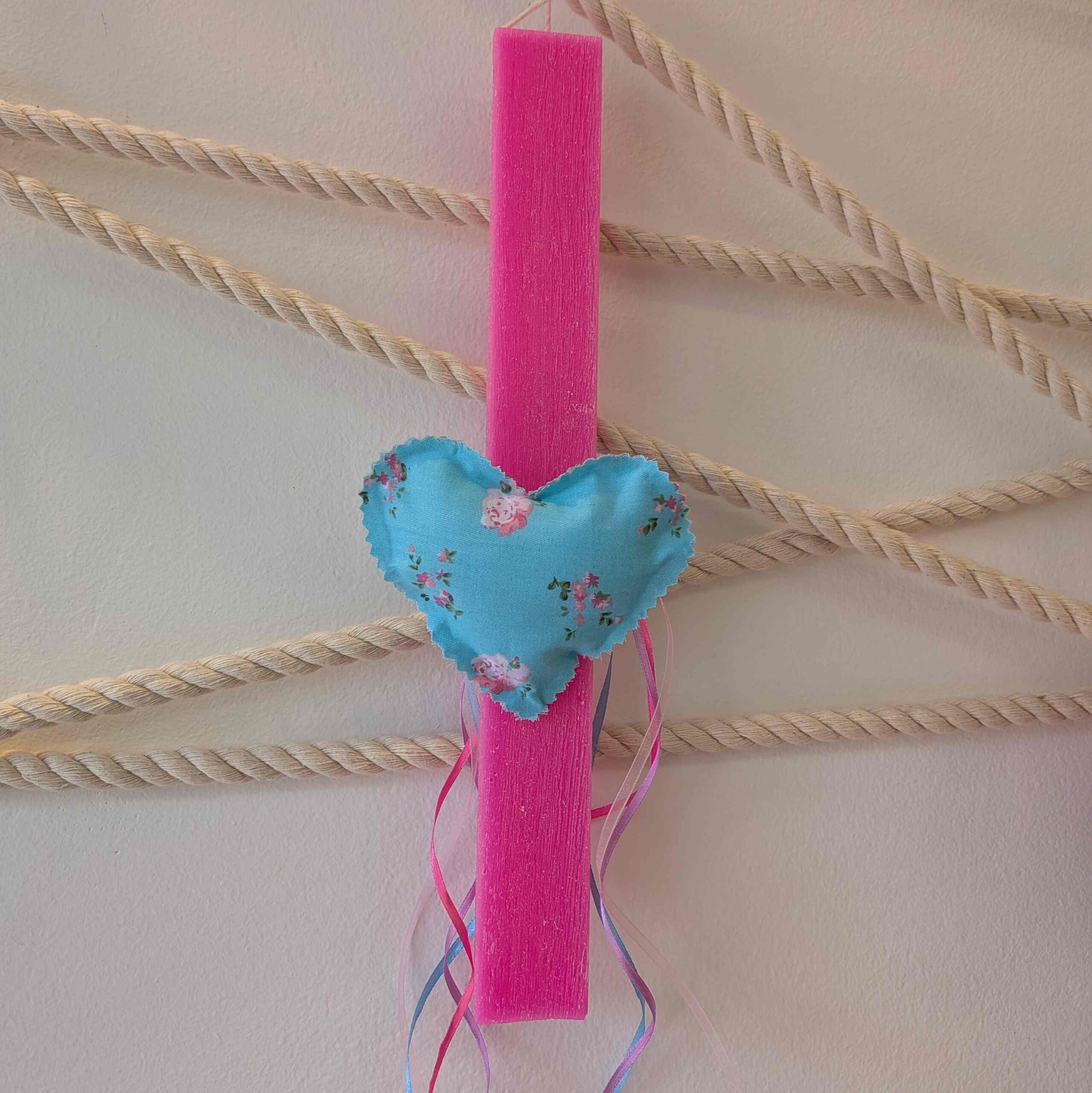Η λαμπάδα είναι πλακέ, ξυστή σε λαμπερό φούξια χρώμα, διακοσμημένη με μια χειροποίητη υφασμάτινη καρδιά, σαν μαξιλαράκι, σε γαλάζια απόχρωση. Το ύφασμα της καρδιάς είναι στολισμένο με ροζ λουλουδάκια, δημιουργώντας μια χαρούμενη και ανοιξιάτικη αισθητική με όμορφες χρωματικές αντιθέσεις. H διακόσμηση ολοκληρώνεται με κορδέλες σε ροζ και μπλε τόνους.