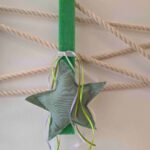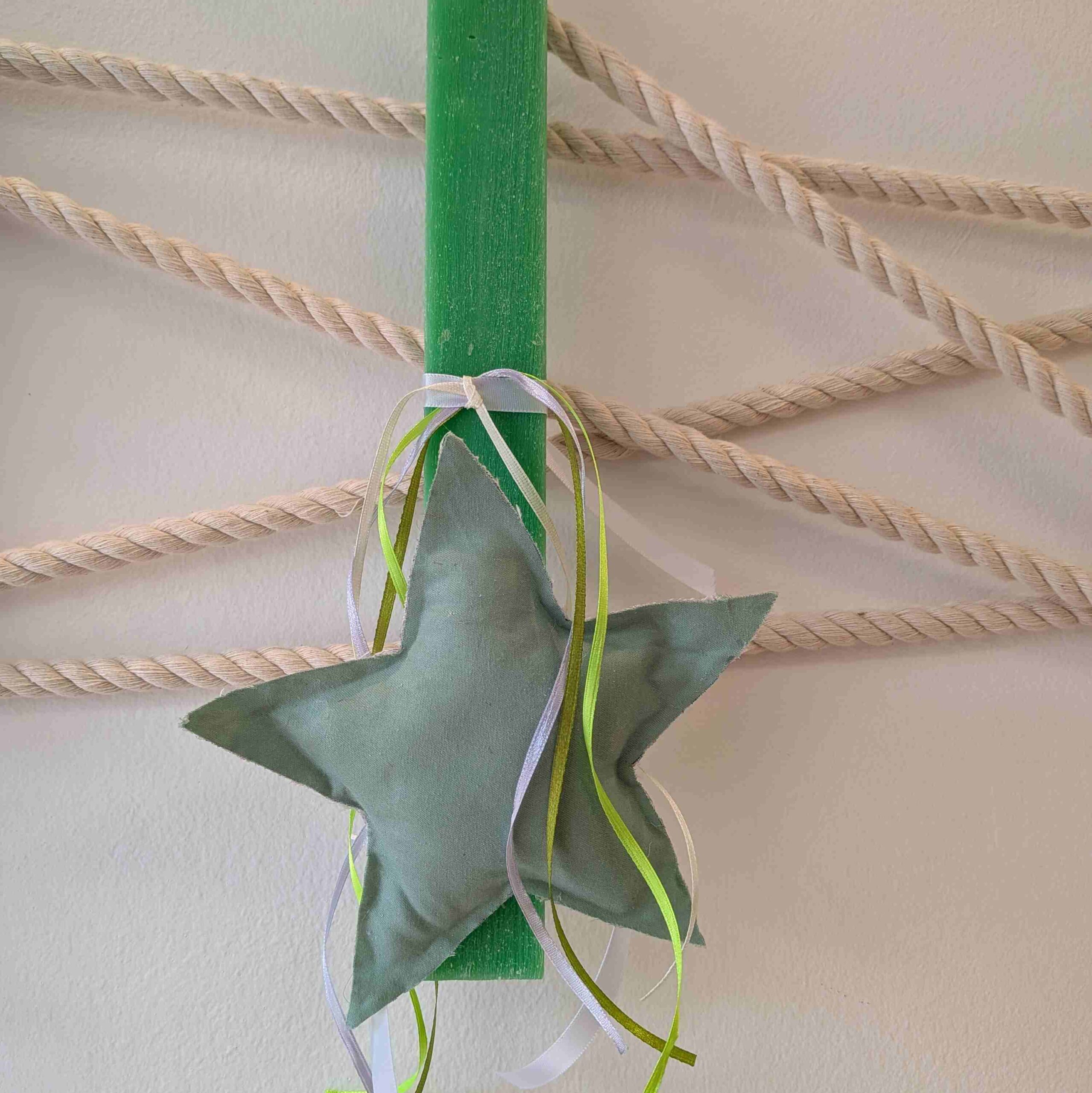 Η λαμπάδα είναι πλακέ, ξυστή σε έντονο πράσινο χρώμα, διακοσμημένη με ένα χειροποίητο υφασμάτινο αστέρι, σαν μαξιλαράκι, σε απόχρωση πράσινου χακί. Ο συνδυασμός των χρωμάτων δημιουργεί ένα αρμονικό και ήρεμο αποτέλεσμα με μοντέρνα αισθητική. Η διακόσμηση συμπληρώνεται με κορδέλες σε παρόμοιες αποχρώσεις.