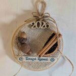 Καδράκι – τελάρο ραπτικής σε γήινες αποχρώσεις, φτιαγμένο με φυσικά υλικά: πορτοκάλι, κανέλα, βελανίδια, ξύλινο στοιχείο με τη χρονολογία 2026 και ευχή «τυχερή χρονιά».