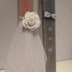 Η λαμπάδα της νύφης είναι πλακέ ξυστή σε απόχρωση σάπιο μήλο, στολισμένη με λευκό τούλι με γκλίτερ και λευκό λουλούδι, αποδίδοντας ρομαντισμό και απαλή λάμψη.