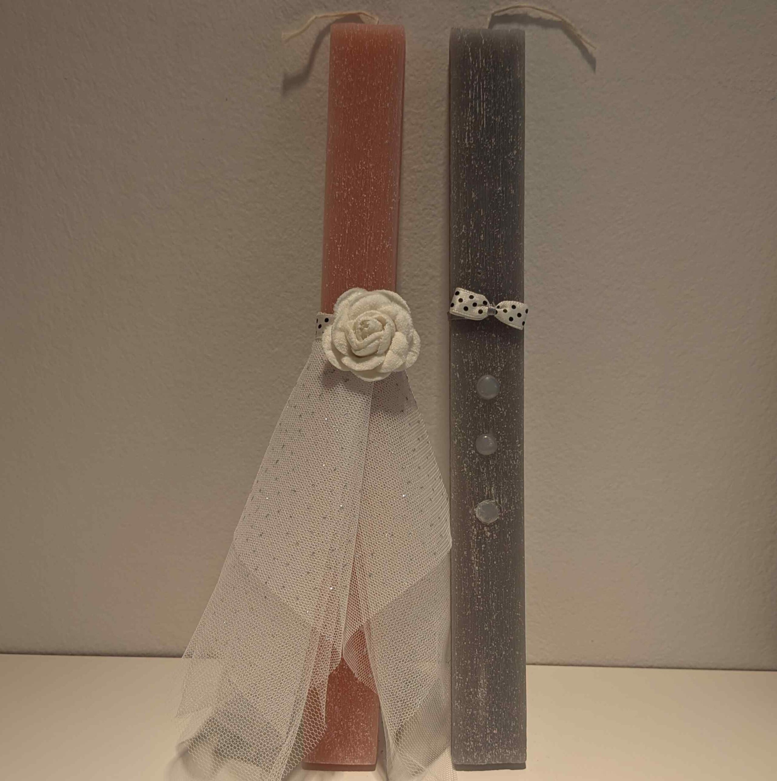 Η λαμπάδα του γαμπρού είναι πλακέ ξυστή σε γκρι απόχρωση, διακοσμημένη με λευκό πουά παπιγιόν και λεπτομέρειες που θυμίζουν κουμπιά, αποπνέοντας στυλ και διακριτική κομψότητα.