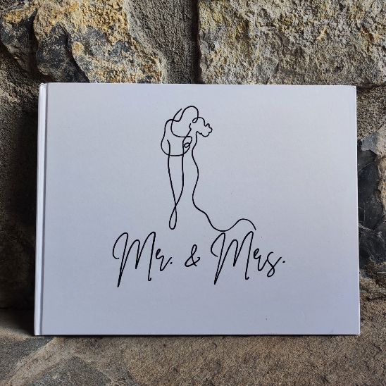 Το εξώφυλλο διακοσμείται από μια διακριτική και καλλιτεχνική απεικόνιση ζευγαριού, σχεδιασμένου στο χέρι με μία συνεχόμενη γραμμή – ένα σύμβολο της ενότητας. Κάτω από το σχέδιο αναγράφεται η λέξη Mr&Mrs, ολοκληρώνοντας την αισθητική με μια μοντέρνα, διαχρονική νότα.