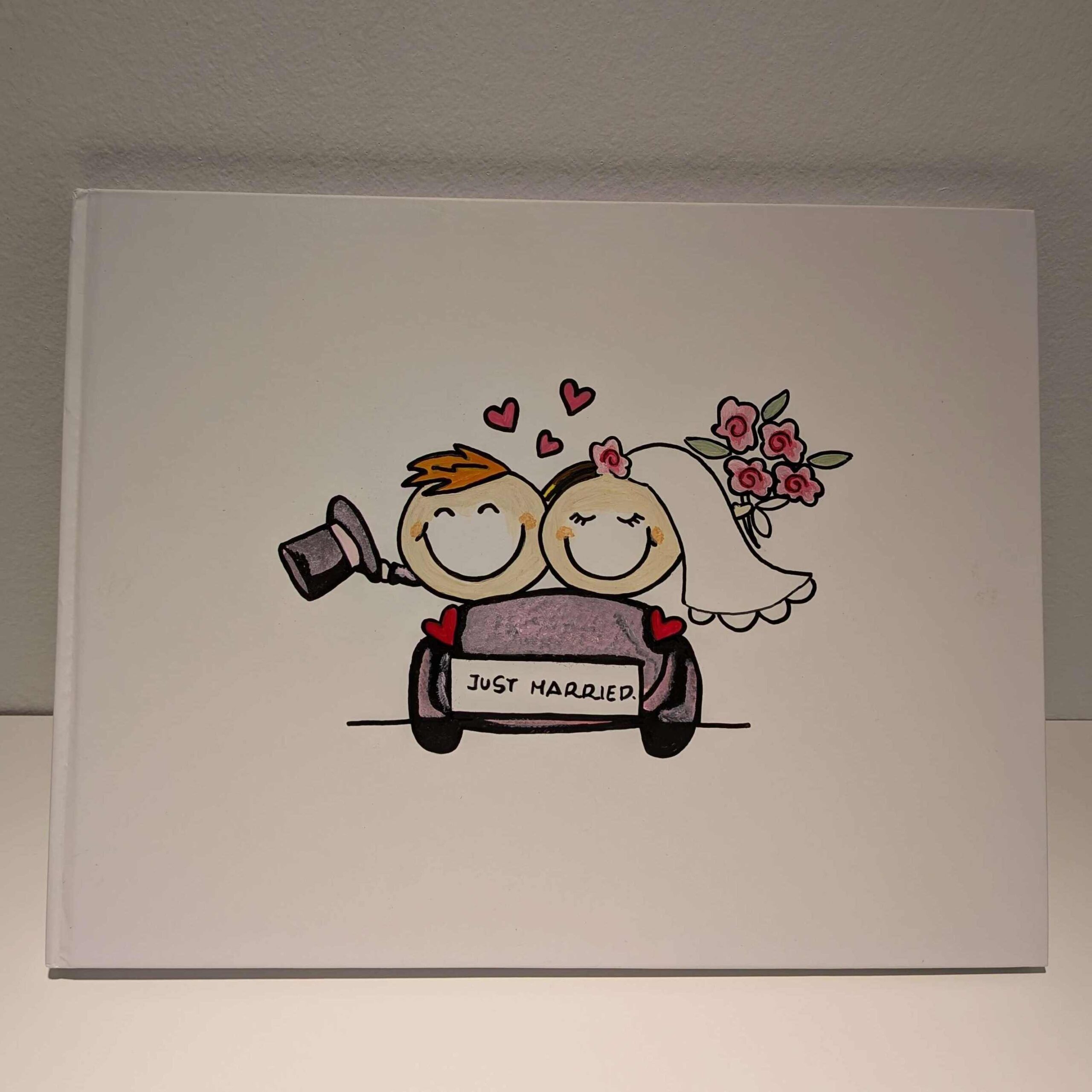 Ένα ξεχωριστό βιβλίο ευχών, ζωγραφισμένο στο χέρι, που αποτυπώνει τη μαγεία της πρώτης μέρας του κοινού σας ταξιδιού. Το εξώφυλλο απεικονίζει ένα χαμογελαστό ζευγάρι μέσα σε αυτοκίνητο, με την αγαπημένη φράση “Just Married” στο πίσω μέρος – μια τρυφερή εικόνα γεμάτη ρομαντισμό και αισιοδοξία για το μέλλον.