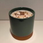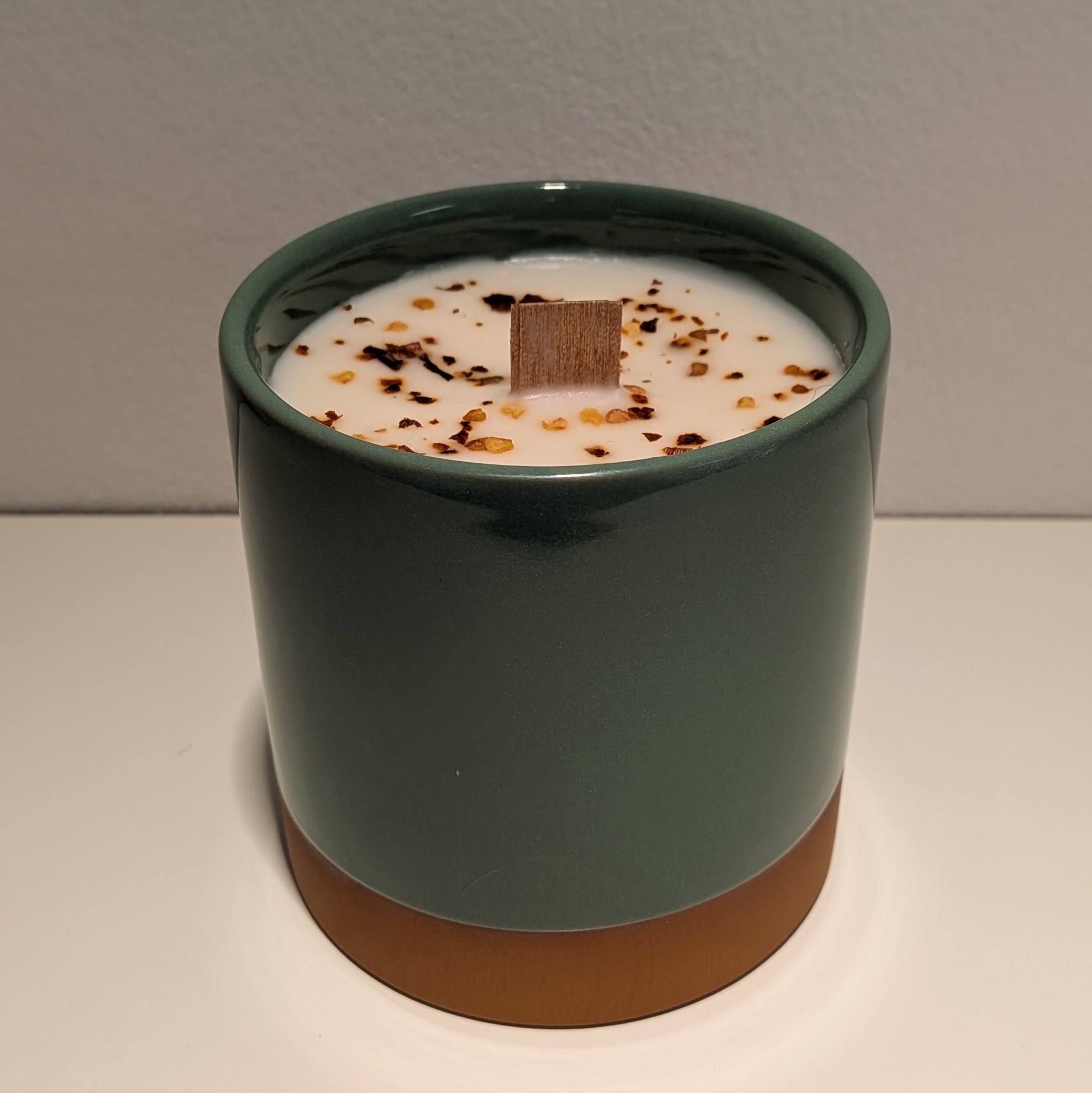 Αρωματικό, φυτικό κερί σόγιας, σε κεραμικό δοχείο, σε απόχρωση μέντας με γυαλιστερό φινίρισμα, φυσική, ματ υφή στη βάση και ξύλινο φυτίλι.