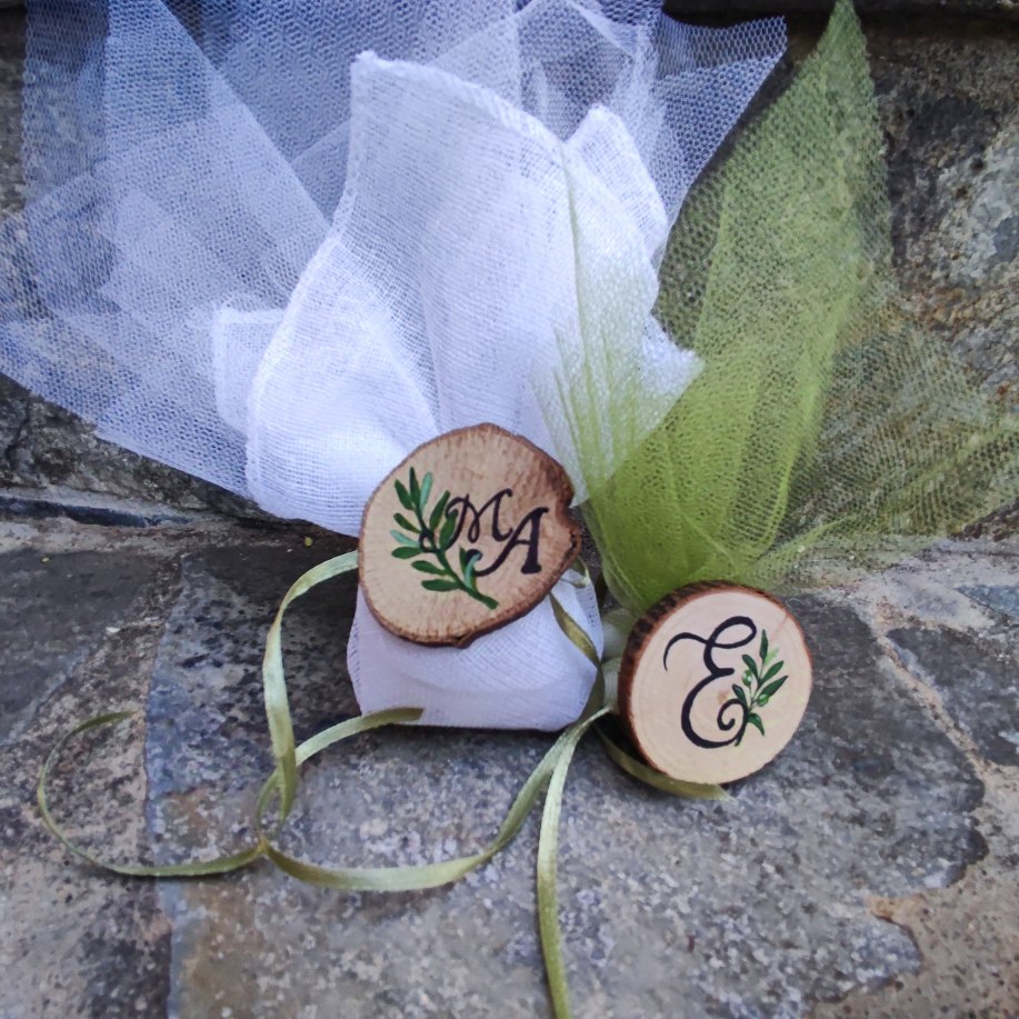 Η μπομπονιέρα γάμου αποτελείται από λευκό τούλι, γάζα και διακοσμείται με ξύλινη ροδέλα, ζωγραφισμένη στο χέρι με τα μονογράμματα του ζευγαριού – ένα τρυφερό και διαχρονικό στοιχείο που ξεχωρίζει.