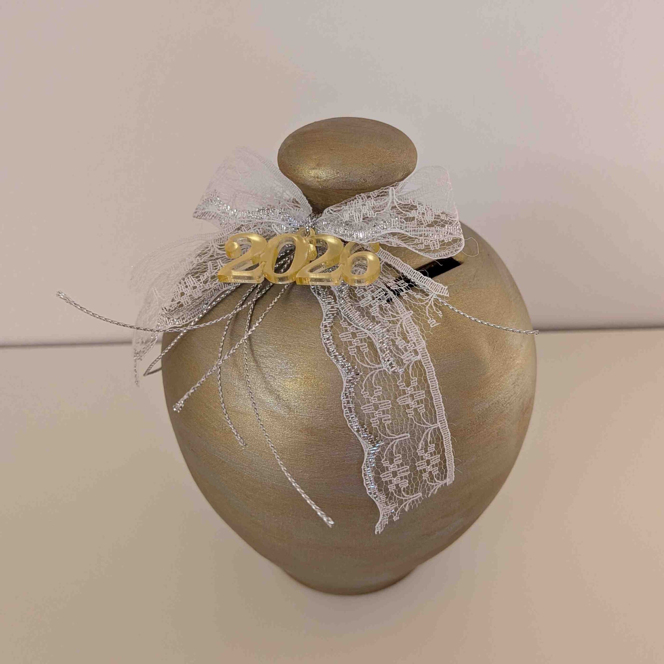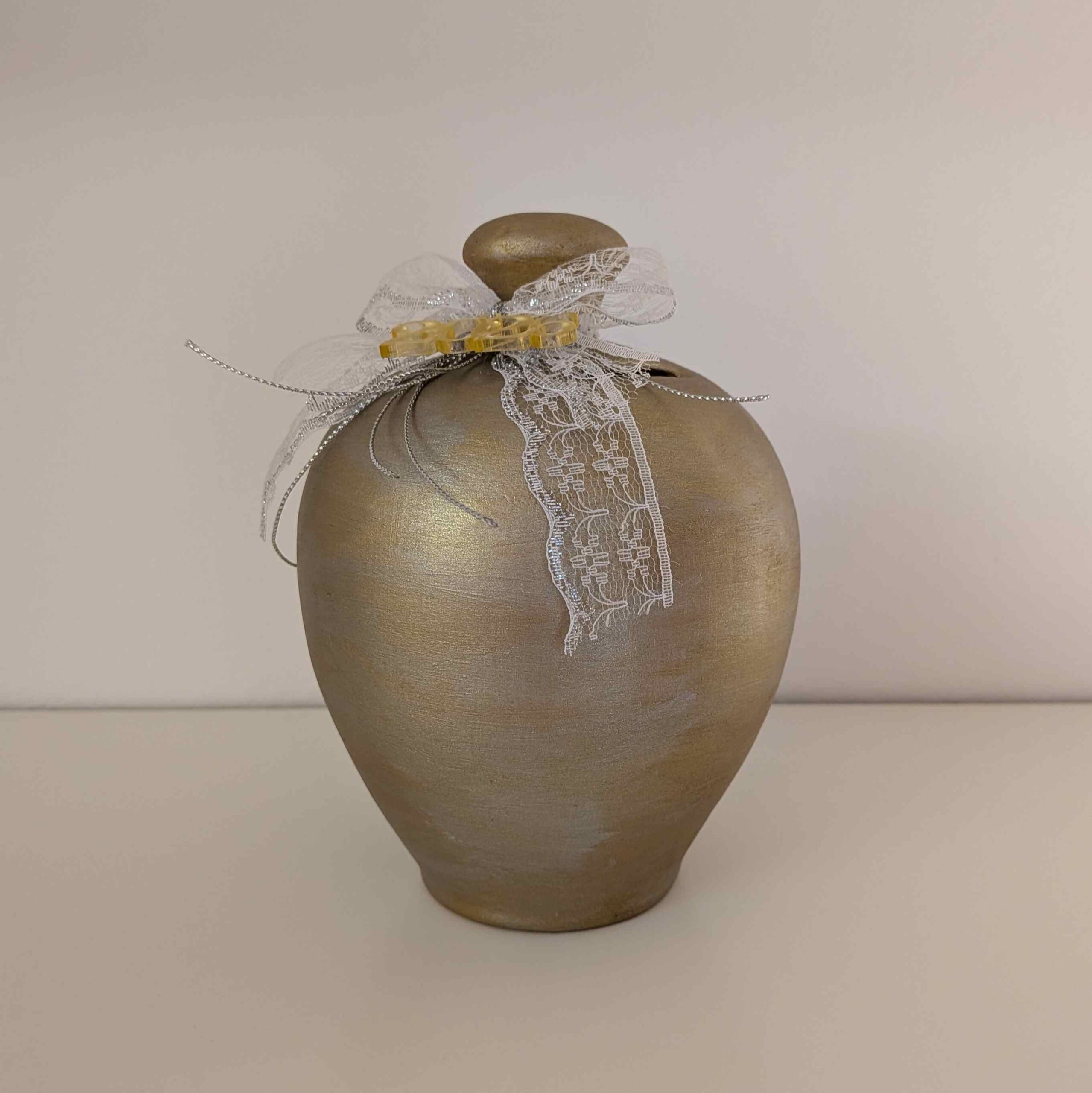 Χειροποίητος κουμπαράς σε χρυσές και ασημί αποχρώσεις, στολισμένος με φιόγκο από λευκή δαντέλα και σατέν κορδόνι.